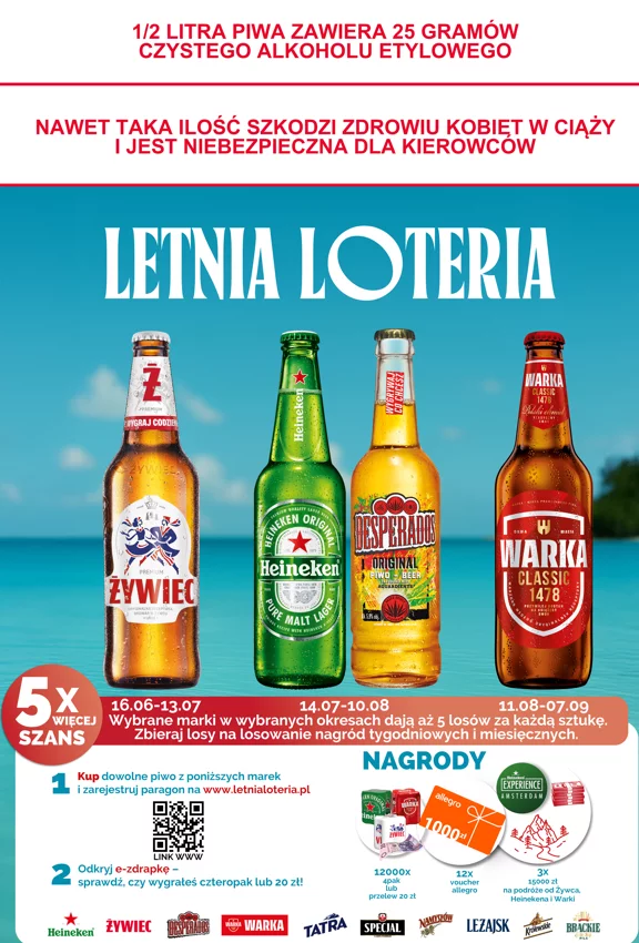 - W terminie między 16.06.2025 r. a 07.09.2025 r., dokonaj zakupu udokumentowanego na jednym dowodzie zakupu promocyjnego, w dowolnym sklepie sieci: ABC, Delikatesy Centrum, Duży Ben, Euro Sklep, Gama (Partnerski Serwis Detaliczny), Groszek, Lewiatan zlokalizowanym na terenie Polski przynajmniej jednego piwa marki Żywiec, Heineken, Desperados, Warka, Tatra, Królewskie, Namysłów, Specjal, Leżajsk, Brackie lub Zlatý Bažant w dowolnym wariancie smakowym w butelce szklanej lub puszce o dowolnej objętości.