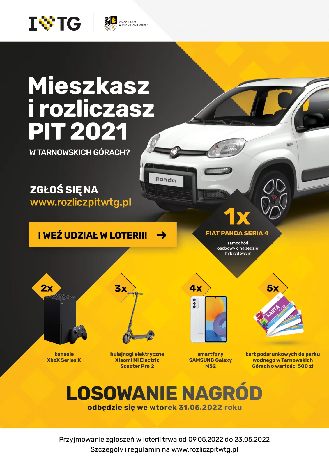 Mieszkasz i rozliczasz PIT 2021 w Tarnowskich Górach - w terminie od dnia 09.05.2022 r. do dnia 23.05.2022 r. dokonaj prawidłowego zgłoszenia w Loterii na stronie internetowej www.rozliczpitwtg.pl