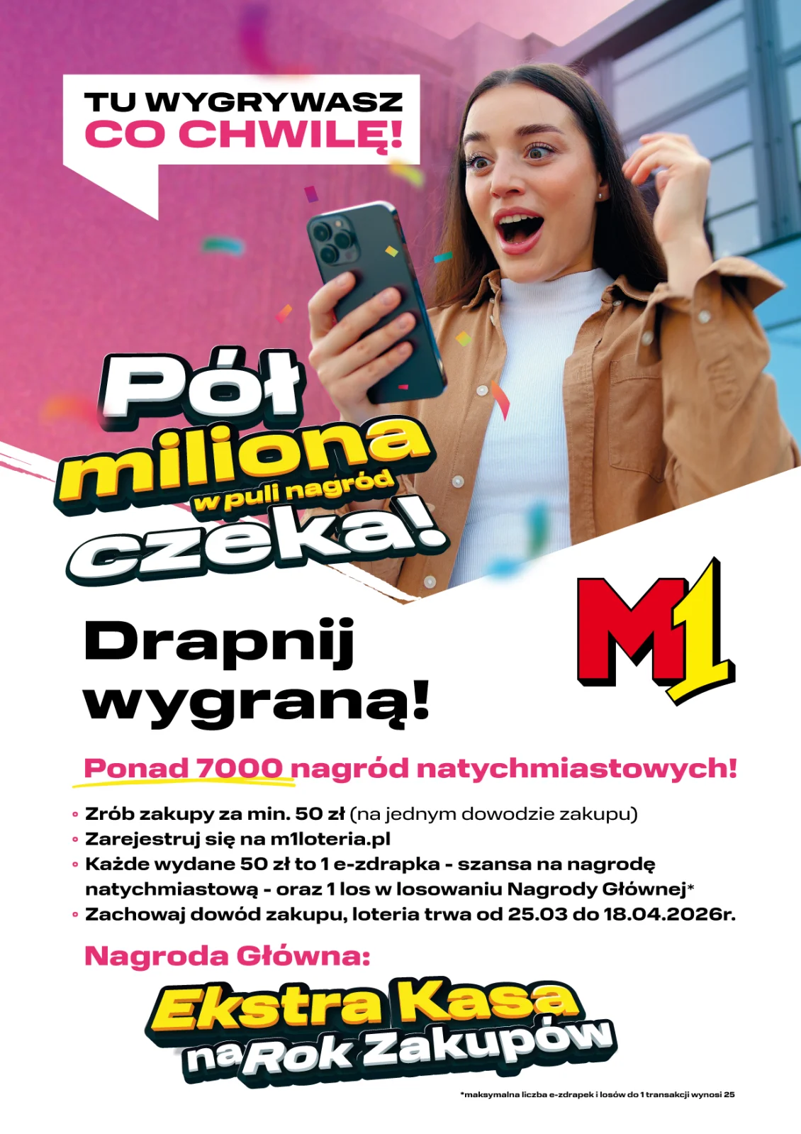 • Między 25.03.2026 r. a 18.04.2026 r. dokonaj jednorazowego zakupu towarów, usług lub Karty podarunkowej M1 na kwotę nie mniejszą niż 50 zł. brutto* w stacjonarnym sklepie znajdującym się w Centrum M1 biorącym udział w loterii.