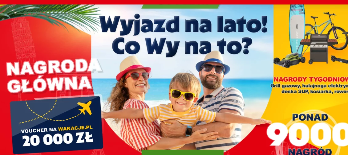 Nagroda główna w postaci bonu wakacyjnego o wartości 20 000 zł brutto do wykorzystania w biurze podróży Wakacje.pl.